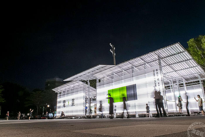 孔廟廣場上的「美感電域」科普特展,純白明亮的發光建築體,在夜晚的廣場上特別搶眼,裡面展出變電箱變美的過程,並解開許多關於電力的謎題,包括電線桿的功能?一度電可供應手機多少電量?都能在這裡找到解答,民眾還能挑戰「台電職人」18公斤的全裝備。