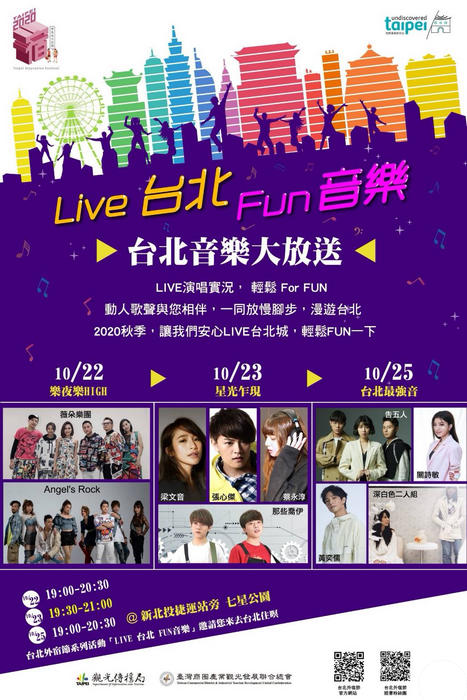 「台北外宿節」系列活動「Live台北Fun音樂」將登場!經過忙碌的白天,在這個逐漸轉涼的夜晚,不妨在10/22、10/23、10/25一連三天晚上到新北投捷運站旁七星公園,參與入圍金曲獎的告五人、星光歌手梁文音等歌手一起,留給自己一段與音樂約會的時光。