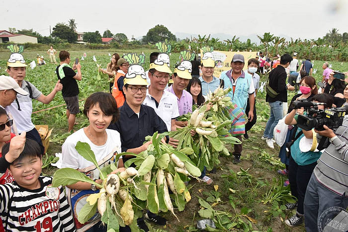 除了邀請入股外,高雄市長陳其邁參與白玉蘿蔔認股、成為股東之一,經過45天悉心呵護和等待,於昨(15)日終可收成採收,上午他捲起手袖,到美濃田間下田開採、樂拔蘿蔔,對於白玉蘿蔔的清甜爽脆讚不絕口,高舉蘿蔔與滿園的大小民眾合影,大力推廣專屬於冬日的好滋味。