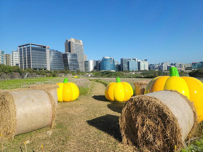 臺北水利處表示,歷年美堤河濱花海獲得大眾熱烈迴響,2021新年初始,期許透過花朵的力量帶給大家溫暖與希望,因此美堤河濱花海特別以整片粉紅色系的大波斯菊及百日草營造,並以豐收好年做為發想,所以以巨大南瓜造型裝置物及稻草捆來裝點,希望呈現富足景緻!