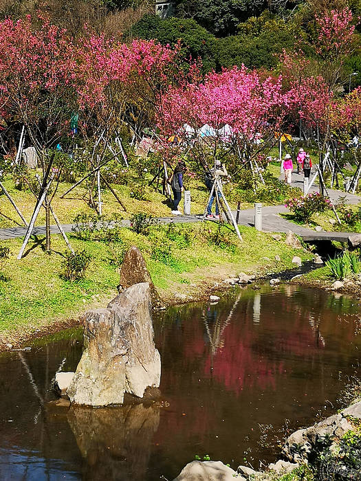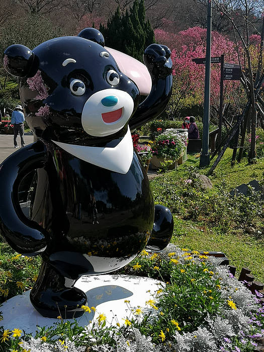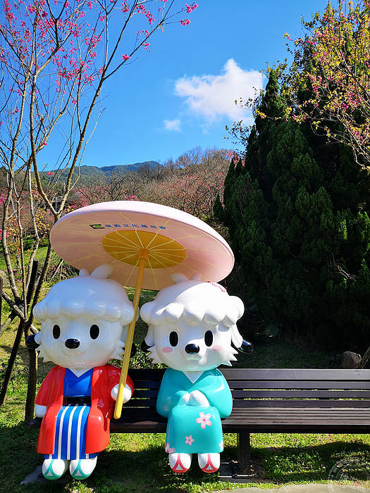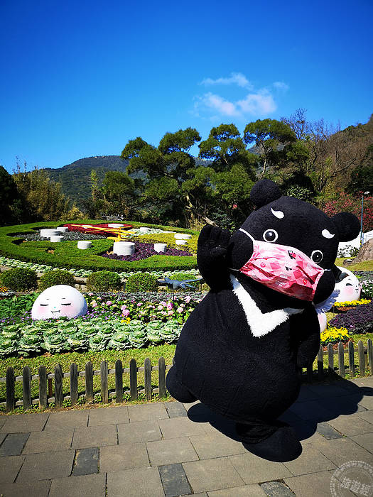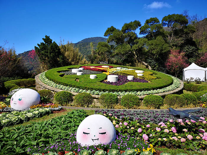 而陽明公園,目前山櫻花也大方展姿,目前陽明公園櫻花溪流區的櫻花花開正盛,再加上溪流倒映,展現浪漫,而陽明公園重要地標,花鐘也換了新裝,湯圓寶寶、熊讚等也在在一旁「逗」熱鬧!