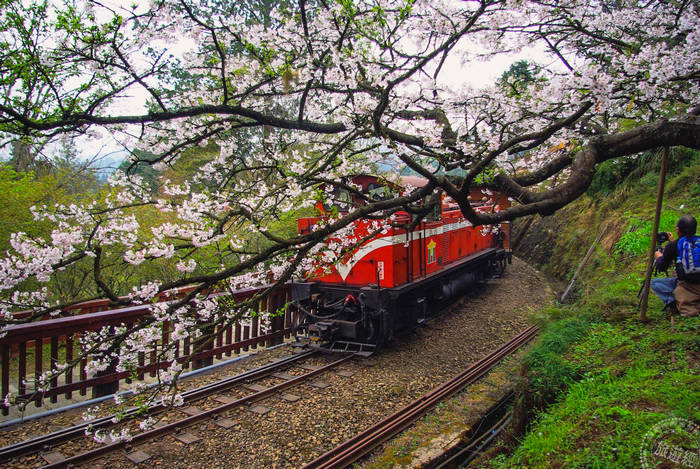 搭乘阿里山小火車從櫻花樹下經過,遠眺山上許多的日式建築,讓人彷彿有置身日本的錯覺