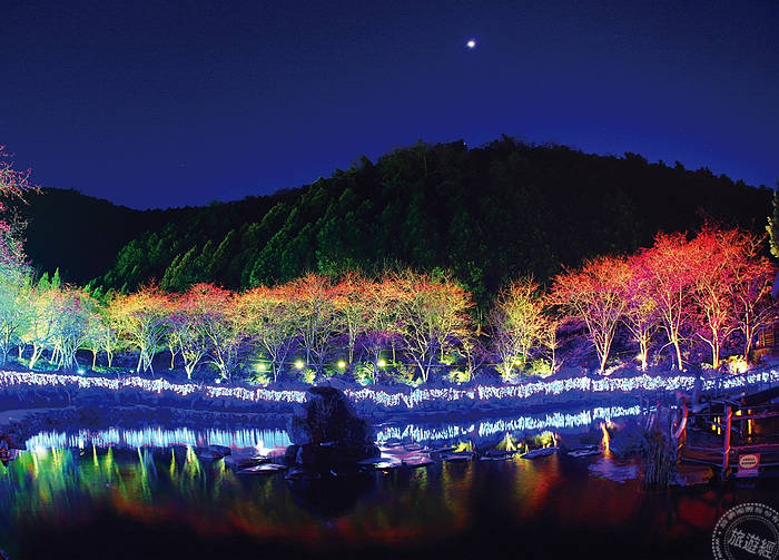 九族文化村被譽為台灣三大櫻花盛景之一的,搭乘纜車從空中欣賞粉色櫻花林,還可以飽覽日月潭美景,櫻花季期間九族園區也推出期間限定表演與攤位,更有期間限定的賞夜櫻活動,黑夜裡的櫻花林打上燈光倒映在湖面,展現不凡的夢幻!