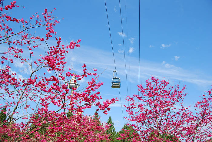 在台灣三大櫻花盛景之一的九族文化村,搭乘纜車從空中欣賞桃紅櫻花林