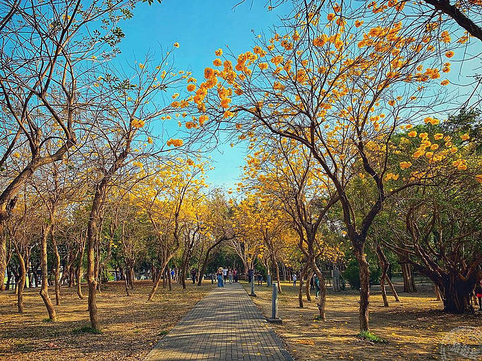 台南億載金城春天是一片金黃,億載公園是台南市知名的黃花風鈴木賞花景點之一,每年2月底、3月初金黃色的花海將公園和行道樹都染黃了,黃花風鈴木在花朵盛開時,通常沒有綠葉的相稱,純粹的金黃色花海相當壯觀,黃花風鈴木在億載金城護城河畔一字排開,岸上的黃花風鈴木與河面的倒影,更是許多旅客取景的熱門角度。