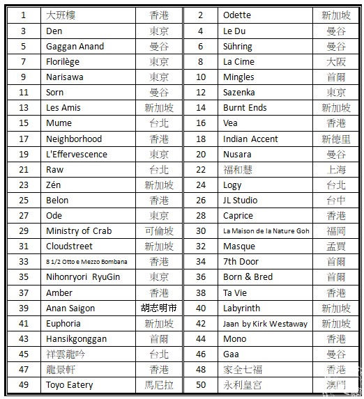 ※.2021年度「亞洲 50 最佳餐廳」獲選名單: