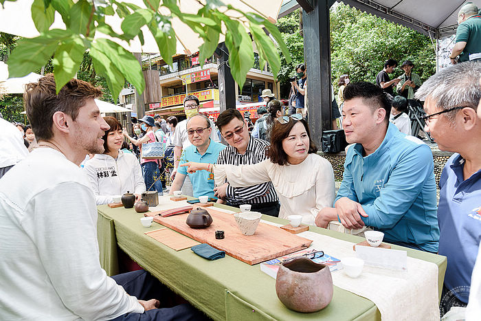 露天茶席活動由台北市副市長蔡炳坤致贈台灣陶藝大師蔡忠南的手作茶碗,蔡大師現場也為大家展示各式精美茶具的陶藝茶席,成為本次茶會最大亮點,另外也邀請鑄劍大師陳天陽第三代掌門人陳重智老師設置茶席「以劍會友、以茶款待」;俄羅斯籍茶師Denis及陳美妃老師等為民眾奉上上等木柵鐵觀音茶。