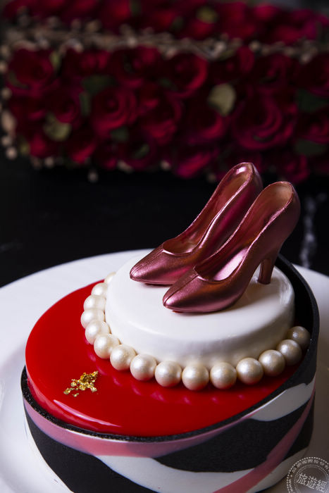 雲品溫泉酒店推出紅色高跟鞋與白珍珠造型的「漾媽咪Young」8吋母親節蛋糕1,080元。
