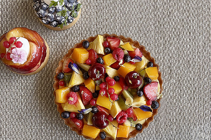 使用大量新鮮水果的「綜合水果塔」7吋480元,香酥塔皮擠上滑順卡士達醬,擺上滿滿草莓、櫻桃、鳳梨、奇異果、藍莓、覆盆子、水蜜桃等果物,清爽誘人。