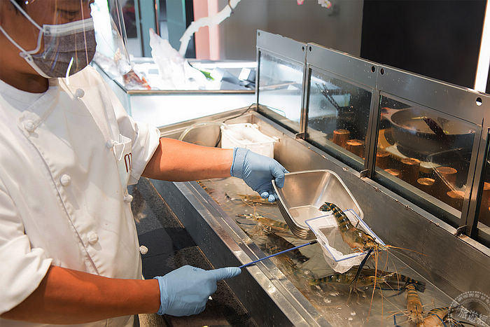 (二)精品水產區 + 代客烹煮服務:道地呈現宜蘭在地海港飲食文化-將活跳跳的新鮮活蝦直接呈現於客人面前,選取後直接交由大廚現場料理,感受最接地氣的品嚐方式。