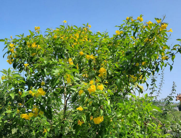 花海區內「黃鐘花」的串串金黃色花朵隨風搖曳,開時滿樹都是金黃色的漏斗狀的鐘型花朵,讓您感受到數大便是美的震撼,與阿勃勒同屬開黃花的木本植物,開花多而且花期長,在中南部幾乎全年開花,也是公園內常見樹種,但不要誤會它是黃色風鈴木或是軟枝黃蟬,黃鐘花也正揮動雙手迎接盛夏的光臨。