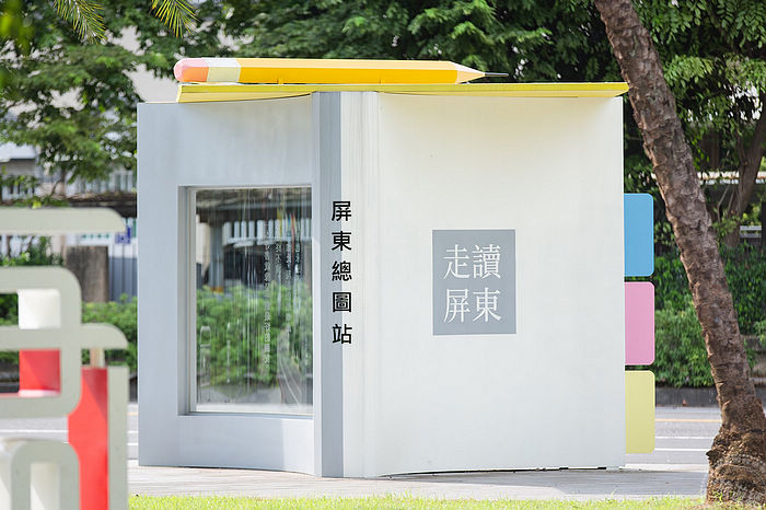 而除了勝利星村公車亭變身為「菜櫥仔」及「老電視機」外,另在屏東總圖站前面也有一座以書來設計,以書本打開為造型,以閱讀屏東概念來設置,讓人一目瞭然就知道屏東圖書館總館到了!