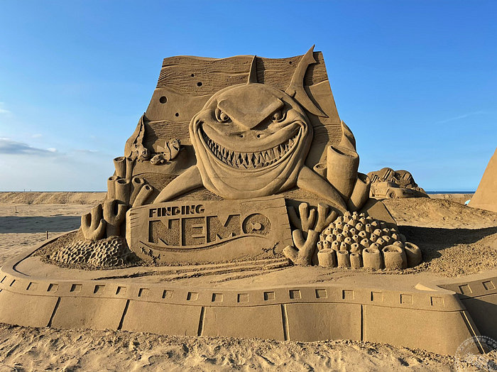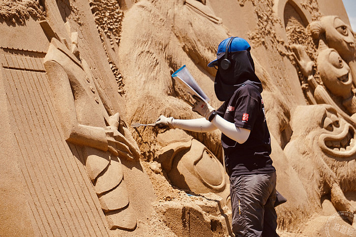 今年整個展期間共投入10名沙雕藝術家,從夯沙模板到塑型,不論風吹雨打,皆有駐點沙雕師以人工方式進行修補維護,以維持沙雕季展期的品質控管,為挑戰「皮克斯經典」的數十部電影角色,十位沙雕師們全部繃緊神經,以多年累積的經驗與技術一刀一刀劃出經典角色的神情。