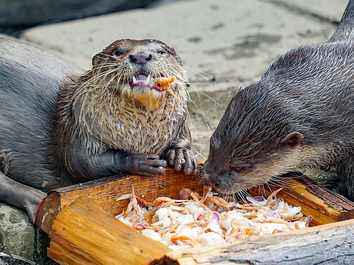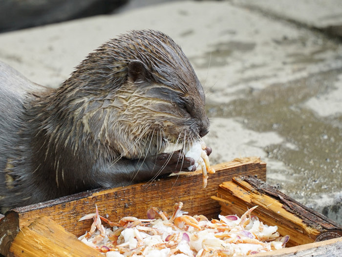 看到小爪水獺兄弟和食蟹獴大啖螃蟹,粉絲們或許忍不住要問:「其他區的水獺們是不是也有新鮮的螃蟹可以享用?」答案當然是肯定的,只是住在雨林區的小爪水獺姊妹「娜美」和「泡泡」,她們喜歡河蝦更甚於螃蟹;溫帶動物區的小爪水獺家族和園內照養的歐亞水獺們,則是偏愛魚肉等主食,所以保育員會為水獺們挑選合適的食材,讓動物們有更多展現不同採食行為的機會,不只吃得健康,也吃得開心。