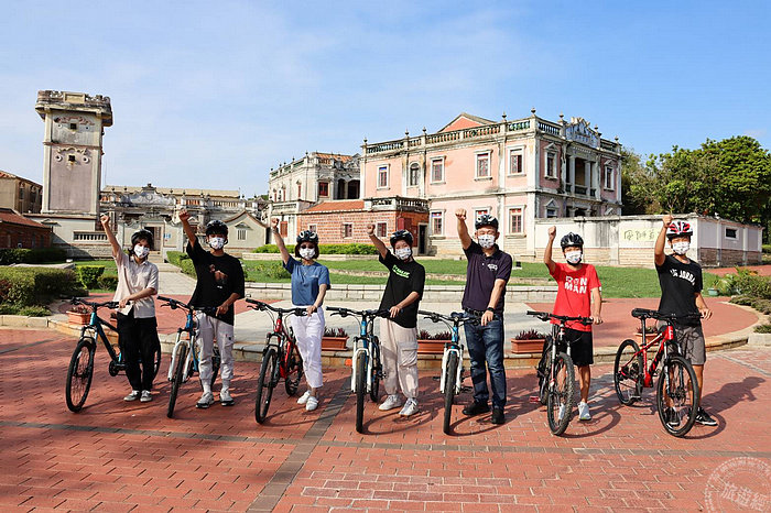 縣長楊鎮浯(右三)、文化局副局長洪蘋萱(左三),與在地青年一起騎單車、看古蹟,推廣2021金門古蹟日。圖片來源_金門縣文化局