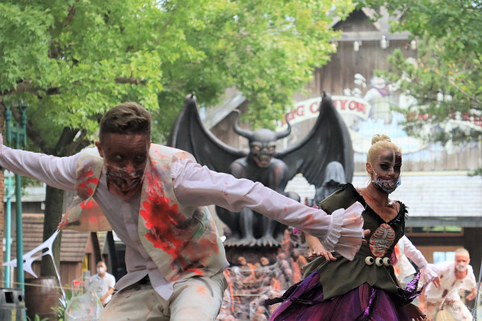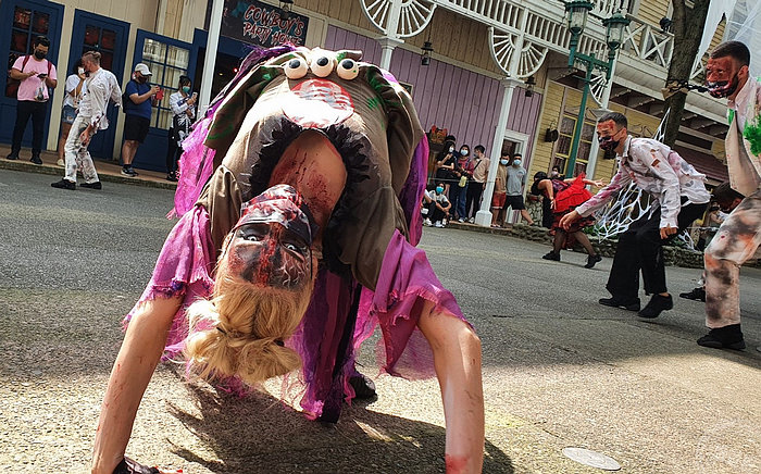 無論是變裝成恰吉、貞子、鬼修女或安娜貝爾,裝神弄鬼的你一旦踏進墓碑鎮,絕對不能錯過充滿詭譎氛圍的喪屍大遊行,日間遊行-萬惡鬼入侵在巫師強力召喚,下午2點準時在美國大西部惡靈大道開趴(逢週一停演),可別以為白天就不恐怖,滿臉血肉模糊的喪屍剎那間以大法師下腰之姿現身眼前,四目相交還是有其可怕之處。