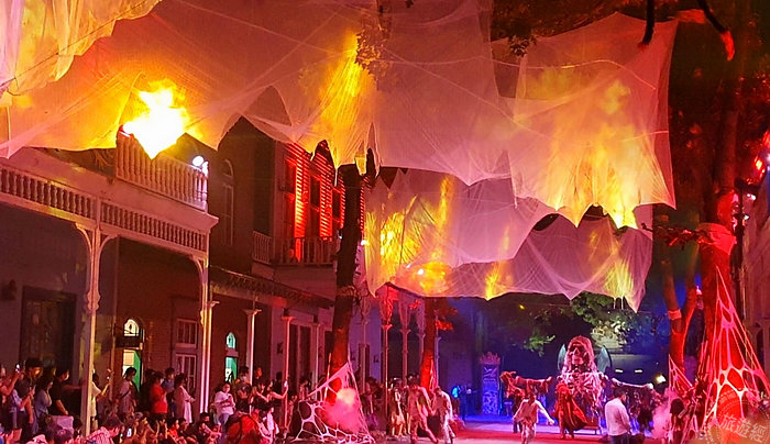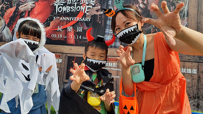 適逢墓碑鎮五週年,園區今年更力邀國際光雕藝術團隊打造夜間鬼城,假日晚間7點限定登場的夜間遊行-厄夜永無盡,喪屍們出沒在瀰漫煙霧的惡靈大道、巨型骷髏鬼王現身,加上天幕投影及燈光聲效,鬼魅氣氛十足彷彿身歷其境,看遊行等同欣賞一場國際級大秀!滿足大朋友的恐怖探險之旅,園區同時也為小朋友量身規劃可愛童趣的萌鬼任務-不給糖就搗蛋,只要換上最萌萬聖裝扮,每逢假日11點及下午3點,就能跟隨鬼王哥哥姐姐們一起沿街進行討糖任務闖關。