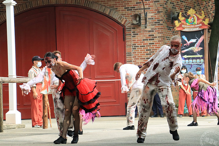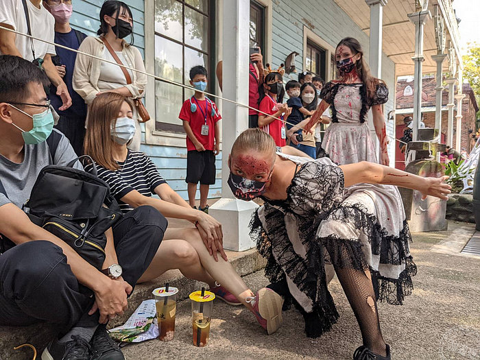 喪屍遊行演出,不忘與遊客互動。圖 六福村提供