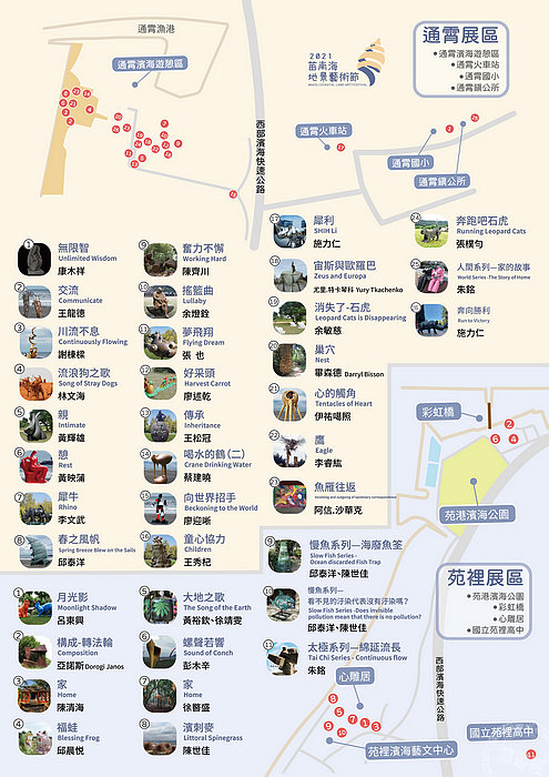 2021苗南海地景藝術節由知名藝術家「邱泰洋」擔任策展人,今年展出的地景藝術品計有32件,其中通霄展區24件、苑裡展區8件,包括有邱泰洋、林文海、李睿紘、徐暋盛、康木祥、伊祐噶照、阿信.沙華克、黃裕欽與徐靖雯、美國畢森德、俄羅斯尤里‧特卡琴科、匈牙利亞諾斯等大師的作品。另位於通霄鎮公所與國立苑裡高中的朱銘大師二件作品及位於心雕居週邊為苗栗慢魚計畫打造的二件裝置藝術,與本次地景藝術節共同展出,民眾可以在展覽期間透過大型裝置藝術、藝文市集、互動體驗、藝文講座、藝文小旅行等型態,於通霄濱海遊憩區、苑裡濱海公園、心雕居、通霄國小、台鐵通霄車站等地區,體驗苗栗通苑地區之美。