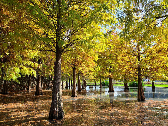 位於海拔約為1600米,南投車程中的杉林溪生態園區,園區有多種楓樹品種,包括青楓、紫葉槭、楓香等,更栽種有數量高達800棵水杉,到了美麗的秋天,火紅的楓葉與金黃水杉接力上陣,將原本一片翠綠的林蔭點綴上紅黃色澤。