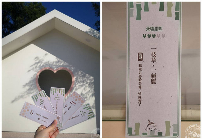 宜蘭質感系生態園區「斑比山丘」開幕2週年,不只走親子路線,現在也走情侶路線,在「感情鹿上」下功夫,園方打造全新地標「愛情小屋」,夢幻可愛的建築甫開放就成為熱門拍照打卡點,在此還能體驗十分有趣的「情鹿籤詩」活動,與小鹿互動求取專屬愛情運勢靈籤!夢幻的全白外觀和可愛的心形窗框,吸引民眾爭相搶拍,而它更是求取「情鹿籤詩」所在地。民眾持全票票根兌換愛心造型紅蘿蔔後,放到指定位置並搖搖鈴鐺召喚梅花鹿前來,依循咬走紅蘿蔔的小鹿名字,加上以自己生日日期換算出的「生命靈數」,便能至愛情小屋拿取專屬籤詩,測出自己的愛情運勢,具創意的小鹿諧音籤詩,讓人莞爾一笑!