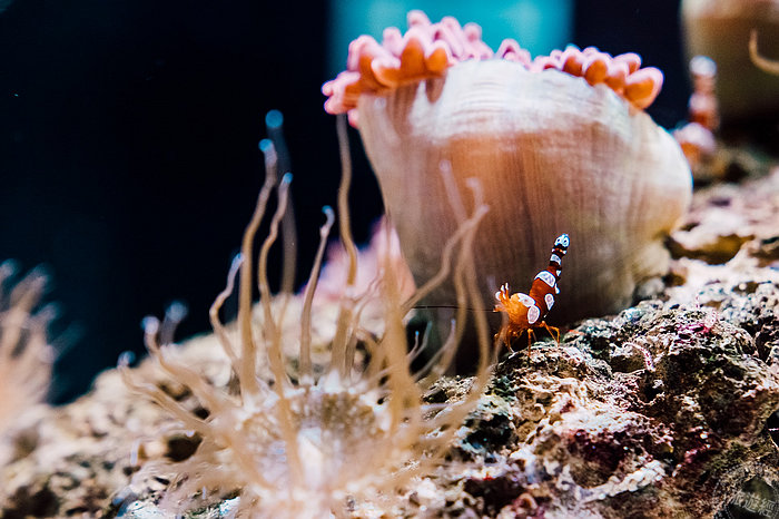 屏東海生館今年冬季全新活動《璀璨之海:共生的海洋日常》,自即日起展開至2022年1月2日止,共展出六種具有共生行為的海洋生物,包含與海葵共生的小丑魚,這應該是許多大小朋友最熟悉的共生,如探尋尼莫、馬林的家一般。另外,還有安波托蝦、海葵蟹、寄居蟹、拳擊蟹等。其中移動時常前後晃動腹部,穿梭於海葵間的安波托蝦,彷彿不斷扭屁股十分可愛,也讓牠們有「性感蝦」的稱號。屬於細螯蟹屬的拳擊蟹,則是因為雙螯常舉著海葵用來捕獲更多食物,就像帶著拳擊手套一般。與海葵共生的寄居蟹更是直接將海葵揹著走,換殼時也會將海葵搬到新的殼上,是十分為人熟知的互利共生生態。