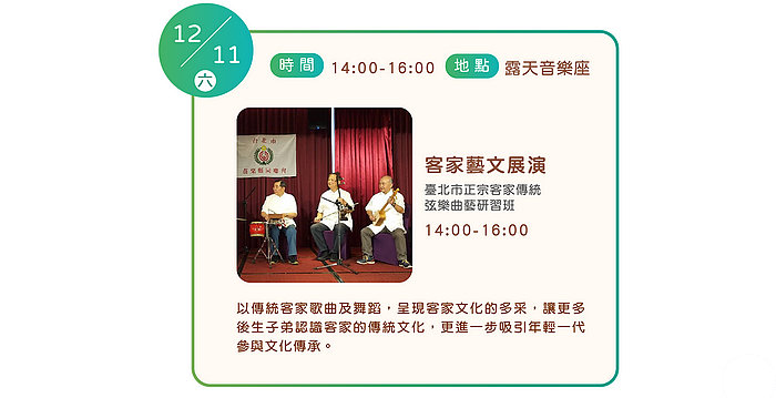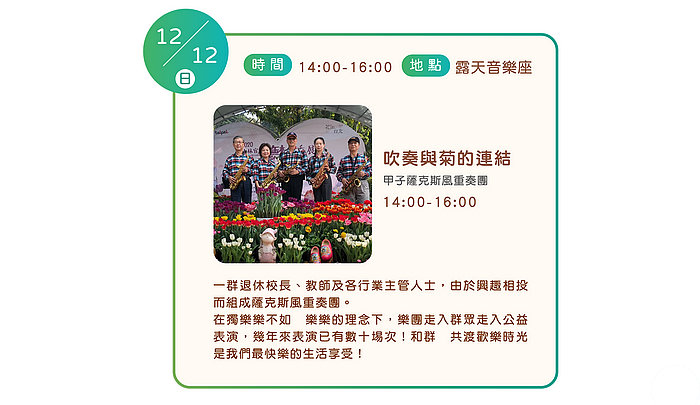 假日也安排精彩活動,12/11(六)兩點於露天音樂座有臺北市正宗客家傳統弦樂曲藝研習班帶來的客家藝文展演;12/12(日)則有甲子薩克斯風重奏團演出「吹奏與菊的連結」」,遊客們可以在賞花的同時享受音樂演出,體驗不一樣的秋日賞花時光。