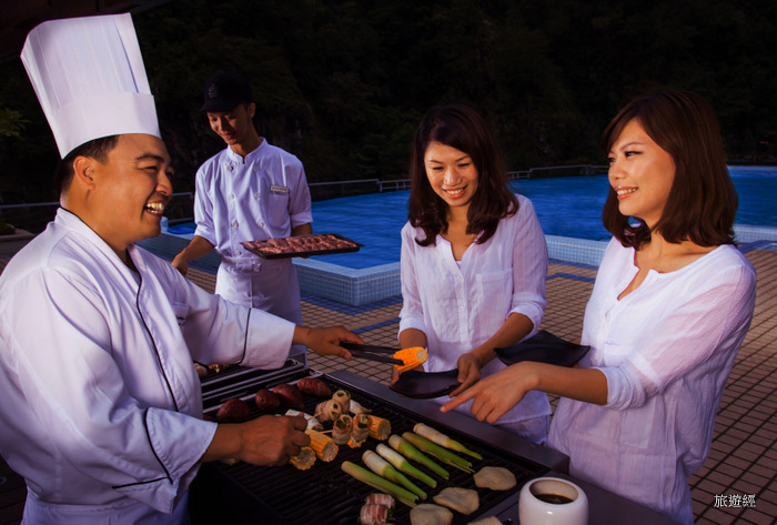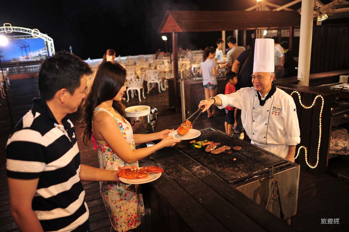 福容旗下漁碼館、樂園館、高雄館、墾丁館提供戶外BBQ燒烤buffet,樂園館9/16(五)-9/17(六)晚間18:00-21:00,在田園咖啡廳準備了「極盛海陸趴」,包括智利的帝王蟹腳、東石運來的蚵仔現烤等,現場還有熱音樂團live band現場演唱,活動現場還有「海飲樂翻天」、「秋風呼呼吹」可拿豐富獎項等。
