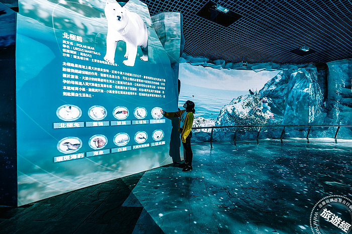 此外,為提升展區知識傳遞服務功能性,南北極區說明看板除了延伸投影畫面外,亦增設感測設備,只要觸控互動螢幕上的生物圖示,即可進一步認識南北極生物,達到寓教於樂的效果。