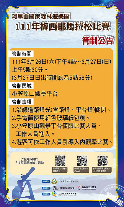 喜愛觀星的族群,對天文有興趣的民眾,請注意!梅西耶馬拉松觀星不僅享受天時、地利、緯度的興奮心情,還讓您整夜不睡!「2022阿里山梅西耶馬拉松」天文活動即將在3月26-27日於阿里山舉行(不用事先報名),屆時各地天文好手不僅會齊聚阿里山,還要挑戰在一個晚上完成110個星體觀測,活動日將會管制比賽場域-小笠原山觀景平台,參與的民眾可在指定區域觀賽,一同觀賞無光害的璀璨星空。