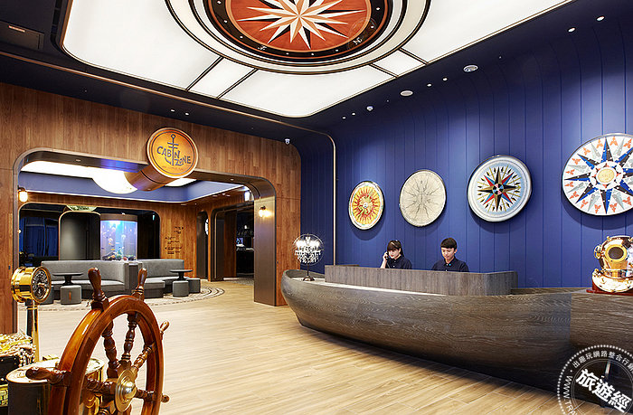 一進入飯店COZZI Blu和逸飯店.桃園館3樓Cabin Zone,Cabin Zone設計以《海底兩萬哩》中的鸚鵡螺號內神祕色彩為藍圖,揉合了18世紀航海風格及當代元素的船艙空間,在串流活動的靈魂人物船長迎賓儀式下,專業的引導旅客逐一體驗Blu Night宿海奇遇中各個精彩環節,如同乘客至一艘郵輪一般,也開始展開海洋系知性航程!