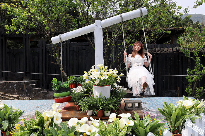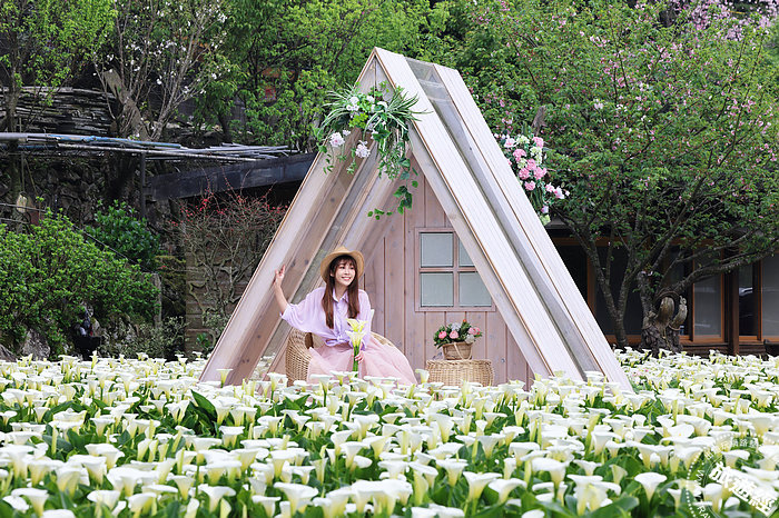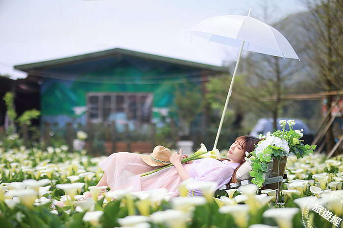 花谷海芋園在海芋田中,搭起一座躺椅及白色遮陽傘,讓人坐著坐著就睡著了!