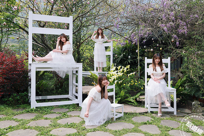 發現生活園藝以等差縮小比例的「白色椅子」,排列錯落在花園中,可營造多樣化拍照效果。