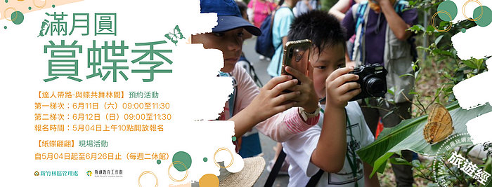 春夏相接,隨著春雷漸弱、夏雨漸增,擁有「北部蝴蝶谷」美名的滿月圓國家森林遊樂區,最美麗的花精靈「蝴蝶」也紛紛換上最耀眼的服裝,在生機盎然的綠蔭當中增添令人目光為之一亮的色彩,目前進入了賞蝶佳期,新竹林區管理處特別舉辦「達人帶路-與蝶共舞林間」主題活動,在專業老師的引導下,邀請您來趟滿月圓賞蝶之旅,並進行一場相關DIY體驗!
