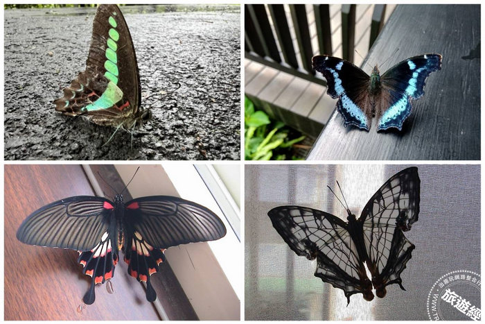 (左上)滿月圓常見青(帶)鳳蝶;(右上)琉璃蛺蝶(圖:滿月圓遊客中心提供);(左下)大鳳蝶;(右下)地圖蝶(攝影:洪書瑱)