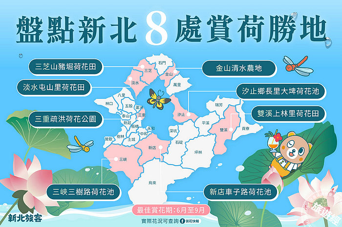 新北盤點8處賞花景點,包括:三芝山豬堀荷花田、淡水屯山里荷花田、三重疏洪荷花公園、三峽三樹路荷花池、金山清水農地、汐止鄉長里大埤荷花池、雙溪上林里荷花田與新店車子路荷花池等。