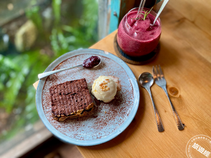 龍宮的甜點師傅星燁,擅長以在地元素創造各式甜點,巧克力蛋糕佐香草冰淇淋和莓果醬、綜合莓果冰沙,深受客人喜愛。(攝影:曹憶雯)