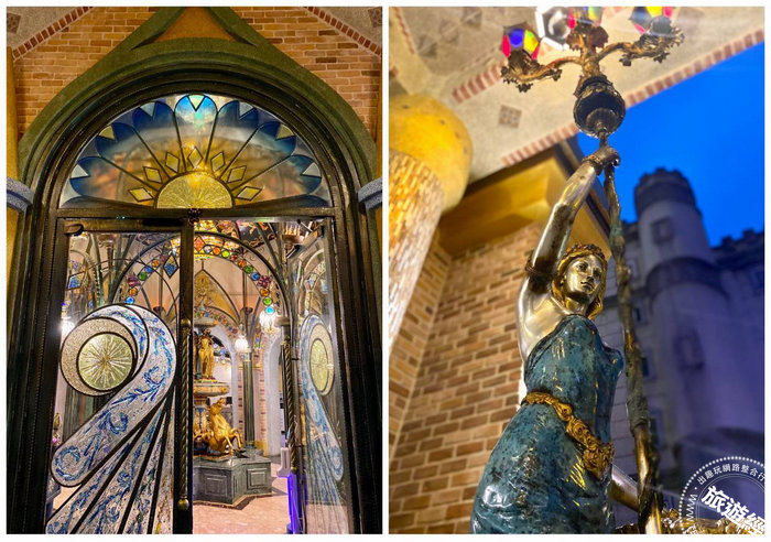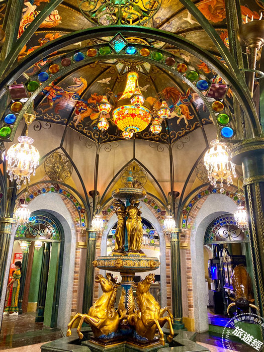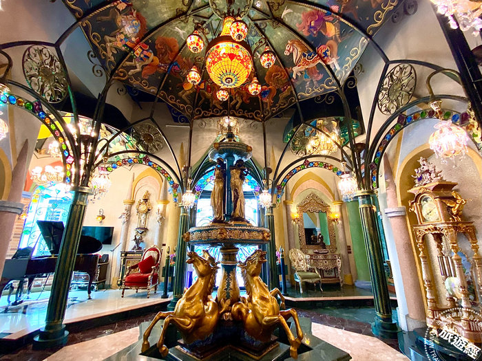 推開琉璃彩繪鍛造大門的剎那,空氣中流淌著鋼琴與小提琴樂聲,迎面而來的視覺衝擊,除了360度的穹頂壁畫、金碧輝煌的希臘神話水池、歐風皇室落地撞鐘、杜拜海灣的貝殼鑲嵌沙發,還有奢華水晶吊燈和讓人目不暇給的藝術收藏,對於喜歡嚐鮮、挑戰嶄新住宿、挖掘新奇事物的旅人,都是特別的體驗。