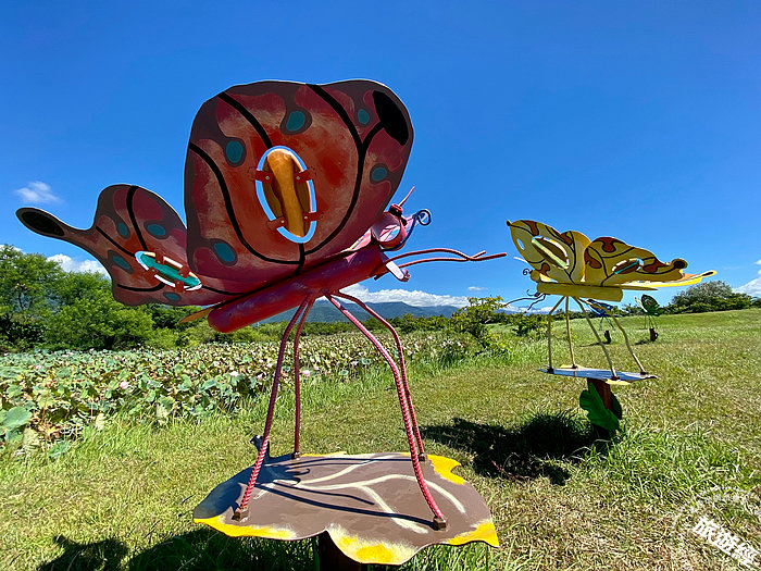 擅長使用異材質的藝術家陳勤作品《蝴蝶來了》,以飛翔的蝴蝶和聽風說故事來傳達細微的美好意象,為鹿野的新良濕地荷花池畔增添想像空間。(攝影:曹憶雯)