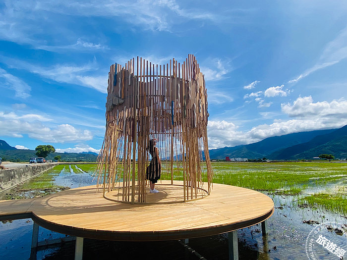 關山稻田中央,佇立著藝術家董旻晋的《川流不息》,歡迎旅人走入作品中,看四季光影變換,聆聽微風與木條合奏,感受大地的溫度與自然的美好。(攝影:曹憶雯)
