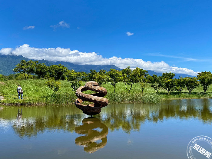 《無盡的流動》深受攝影師喜愛,設置於鹿野新良濕地水池中,由英國藝術家Tim Norris創作,以鋼架構成作品的骨架,輔以延展性高的材質進行編織,呈現剛柔並俱的美學內涵。(攝影:曹憶雯)