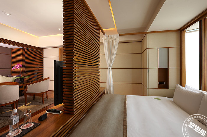 沐蘭套房有倚著落地窗的大床引入窗外的陽光與綠意,木質的地板與隔柵也充滿南國風情與優雅靜謐感