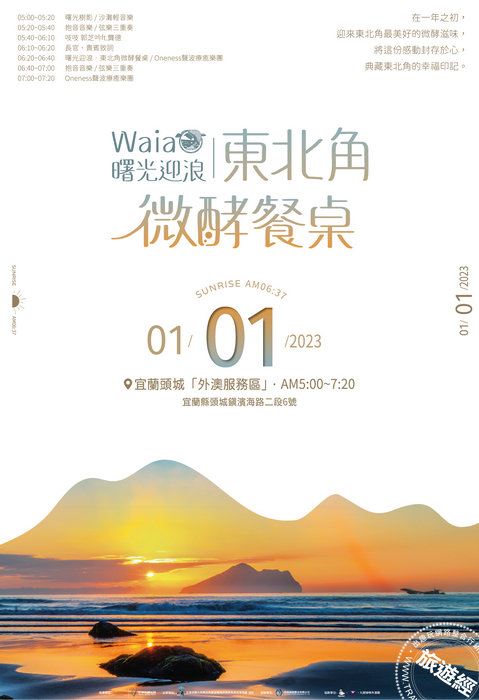 2023年即將來臨,東北角管理處為與民眾一起迎接沿岸山城的首道金光,在宜蘭頭城外澳服務區推出「Waiao(外澳)曙光迎浪-東北角微酵餐桌」活動,以充滿在地特色、富含儀式感形式來迎接新年的第一道光,邀請旅人在2023年1月1日清晨前往外澳海灘,共度美好的微笑進行曲,相關活動於明(2023)年1月1日5:00開始,至7:20結束!提醒民眾相關遊客人數將象徵112年,僅限$112位參與!