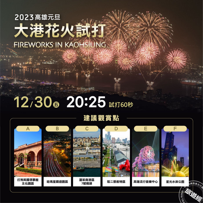 而欲前拍攝或觀看煙火的民眾,高市府和高流臉書也同步公開最佳觀賞點,除了高流園區內的海風廣場、音浪堤岸、位於光榮碼頭的珊瑚礁群、鯨魚堤岸、海豚步道等地點,民眾也可以前往打狗英國領事館、蓬萊商港區7號碼頭(棧庫群)、駁二藝術特區及星光水岸公園觀賞。