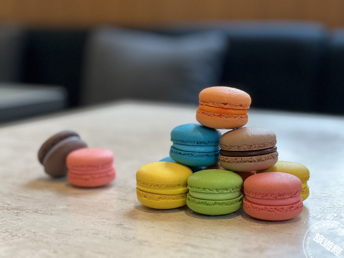 品文旅在情人節當天早餐提供馬卡龍甜點,共有七種口味草莓、焦糖、宜蘭烏龍茶、巧克力等,用餐房客可免費自行取用。