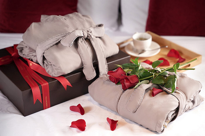 入住君品酒店【愛戀雙饗】行政套房專案,再加贈價值1,400元「君品經典浴袍2件」禮盒。