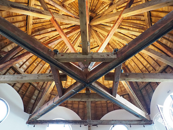 市役所採用磚構造、木構造、鐵筋混凝土構造及鋼構等技術組合而成,三樓圓頂閣樓由正八角形骨架組成,圓頂下的木衍架,如傘骨結構,撐住上層圓頂,木架構需保持適當的溫度與溼度,因此下方開設了7扇圓拱型牛眼窗,做採光和空氣流通用。