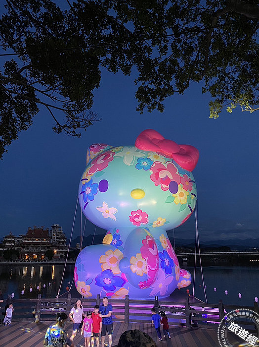 展出期間不僅可以在白天完整觀賞到作品落座於龍潭大池中央,搭配後方南天宮與大池吊橋相互映襯,凸顯而出的壯觀之姿。夜間也將進行「夜間燈光秀」展演(每晚19:00-20:30之間,每30分鐘一場,每場5分鐘),替作品染上絢爛耀眼的魔幻七彩燈光,結合動感節奏樂曲,為民眾帶來精彩的聲光視覺饗宴。除了亮點水上裝置作品,龍潭大池池畔也特別設置可愛打卡拍照區,包含有客家擂茶、經典歷史建築「大平紅橋」、客家文化聚落「三坑老街」及日式老宿舍「十一份觀光文化園區」等意象的裝置,讓民眾可以跟著「Hello Kitty」的腳步一起輕鬆遊龍潭。